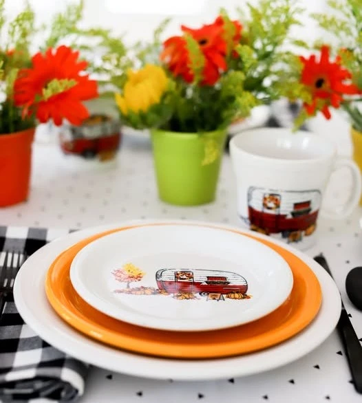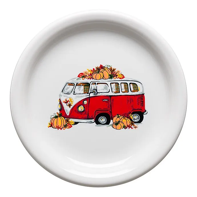 VW Bus and Harvest Trailer VW Bus and Harvest Trailer – Pattern Numbers 42299 and 42300This pattern was introduced in 2020 and was an exclusive to Bed Bath and Beyond until 2022 when it became available to general retailers. It was discontinued 2023It was produced on White and can be found on the following shapes listed below. Thank you to the Fiesta® Tableware Company for the use of their photos on this page. Click here to purchase Fiesta® directly from the Fiesta® Tableware Company. Pattern number 42299 was produced on the following shapes, the bistro coupe salad plate (1481) as illustrated to the right and the tapered mug (1475).Like the Holiday Trailer with Trees pattern, the tapered mug had both the VW Bus and the Harvest Trailer on the mug. Pattern number 42300 was produced on the following shapes: bistro coupe salad plate (1481), as illustrated to the left, and rectangle platter (1501).