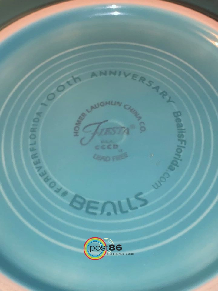 Pineapple - Beall's Pineapple – Beall’s – Pattern Number – Numerous see belowThis pattern was introduced in 2015 to celebrate the 100th anniversary of the Beall’s department store, as the store was founded in 1915. Discontinued 2016This pattern was produced in two different glazes as shown below.Thank you to Joni McCollum for the use of her photo. Pineapple – Lemongrass – Pattern Number 41197Produced in the following shapes: classic luncheon plate (0465) and java mug (0570).Thank you to Alex Silva for the use of his photo. Check out his Instagram page Casadefiesta68. Pineapple – Turquoise – Pattern Number 41196Produced in the following shapes: classic luncheon plate (0465) and java mug (0570).Thank you to Alex Silva for the use of his photo. Check out his Instagram page Casadefiesta68. All the pieces in this pattern had the Bealls 100th Anniversary backstamp applied to the piece as illustrated to the right.Thank you to Alex Silva for the use of his photo. Check out his Instagram page Casadefiesta68. Updated 4-11-2026 – added photo of backstamp and added link to Alex’s Instagram page. (MC)